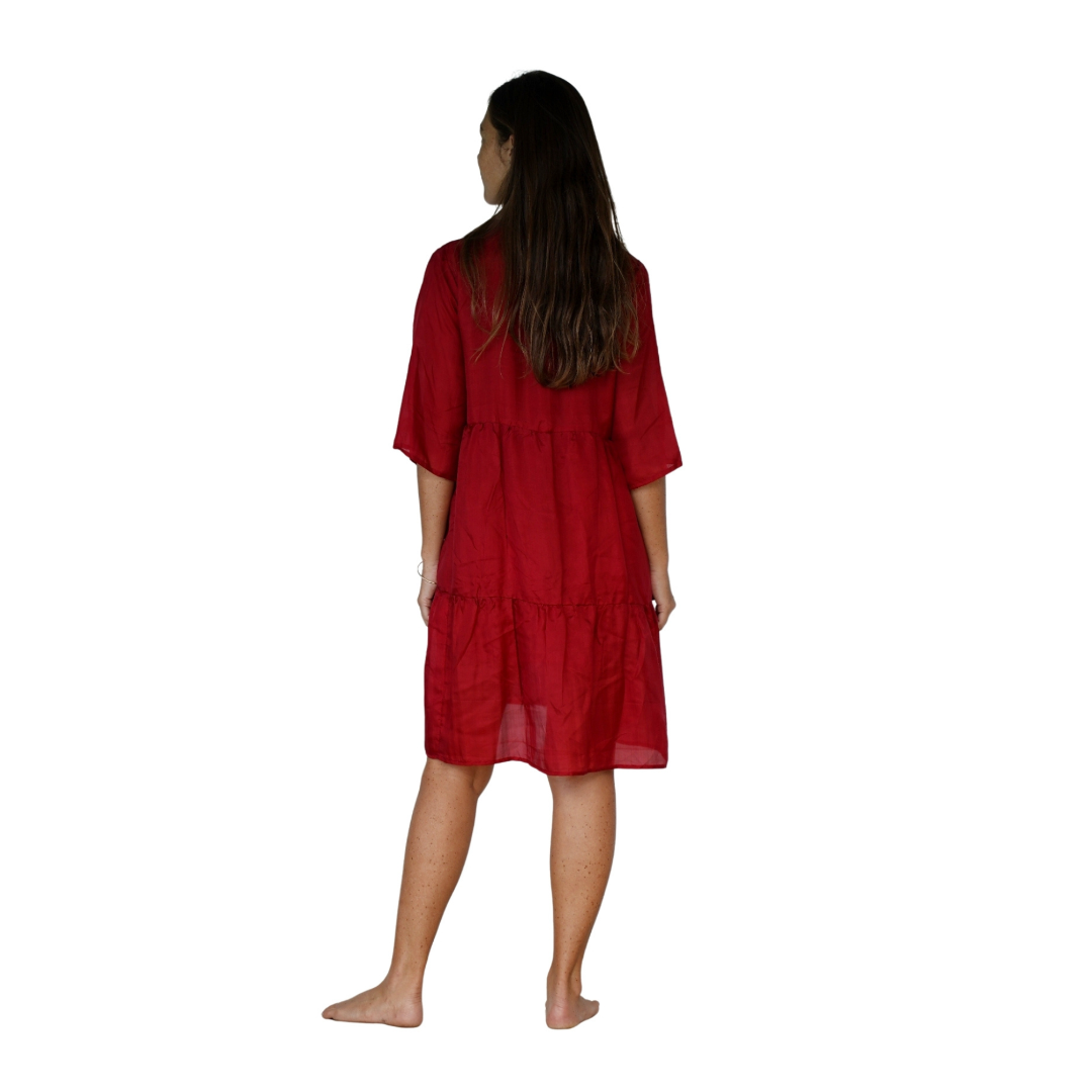 Cette robe courte en soie vietnamienne allie élégance et confort avec une touche contemporaine. Sa couleur bordeaux profonde dégage sophistication et raffinement , parfaite pour se démarquer lors d'occasions spéciales.